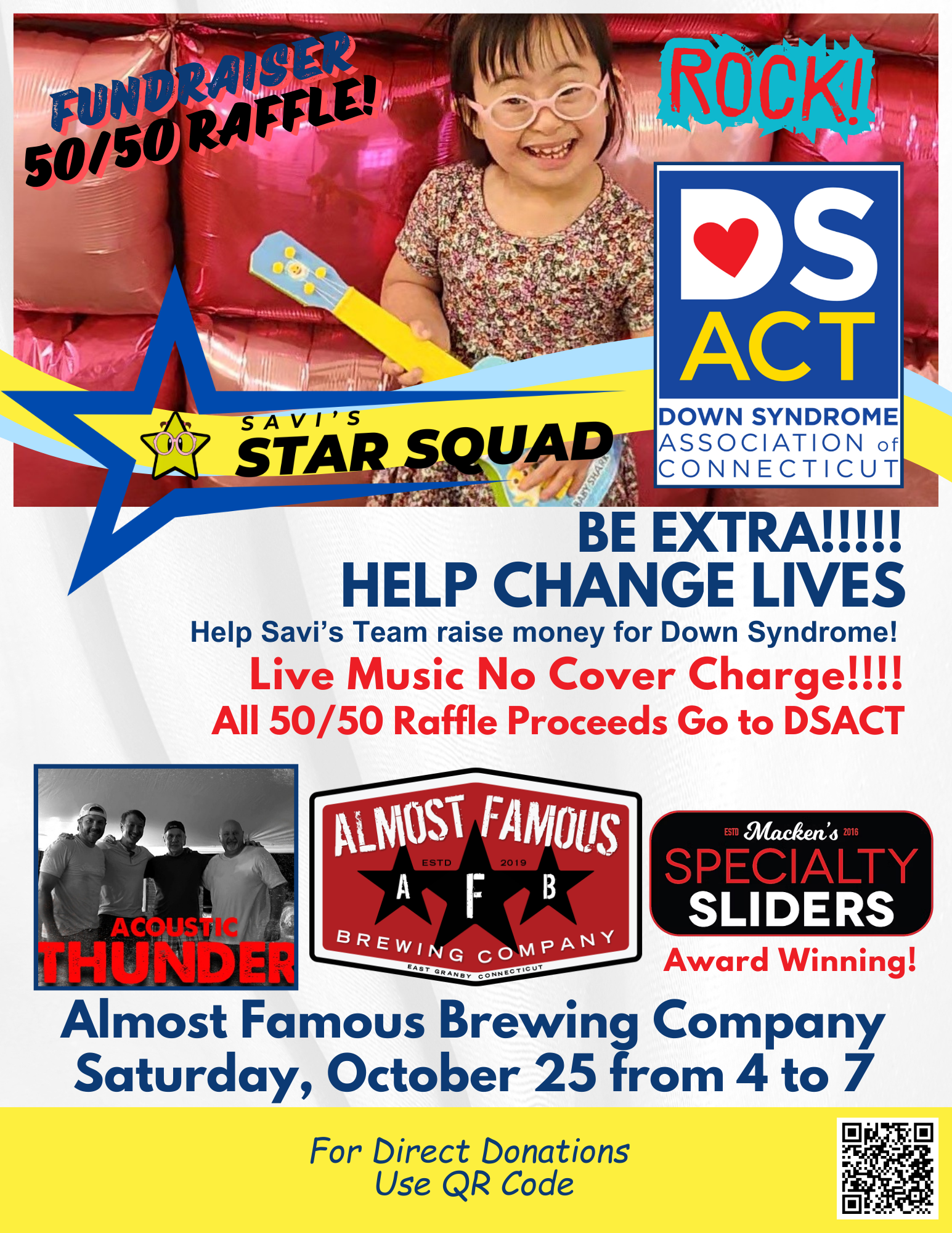Help Savi's Star Squad team raise money for Down Syndrome Association of Connecticut! This is the 2nd annual event with live music from Acoustic Thunder, award-winning food from Macken's Specialty Sliders, and our ice cold refreshments !! Bring your family and help support a great cause! If you can't make it, please consider making a donation. Thank you.
